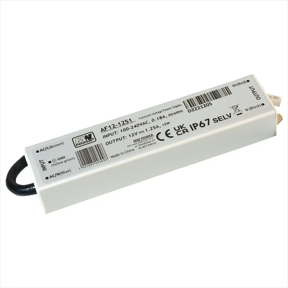 Zasilacz LED napięciowy hermetyczny marki MW Power w niewielkiej obudowie 12V 1.25A 15W AF12-1251 przeznaczony jest do pracy w systemach oświetleniowych oraz w systemach elektroniki przemysłowej. Znajduje zastosowanie w szczególności do zasilania taśm LED, modułów LED, paneli LED, liter świetlnych, sterowników LED itp.