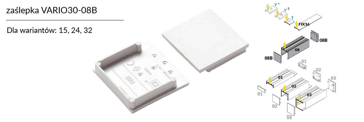 Każda z zaślepek dedykowanych dla systemu VARIO30 w swej budowie zawiera oznaczenia, które odpowiadają za kompatybilności zaślepki z wybranym profilem z układu VARIO30. Takie rozwiązanie pozwala na bezproblemowy i jednoznaczny dobór zaślepki do wybranego przez klienta wariantu.