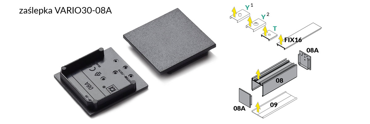 Każda z zaślepek dedykowanych dla systemu VARIO30 w swej budowie zawiera oznaczenia, które odpowiadają za kompatybilności zaślepki z wybranym profilem z układu VARIO30. Takie rozwiązanie pozwala na bezproblemowy i jednoznaczny dobór zaślepki do wybranego przez klienta wariantu.
