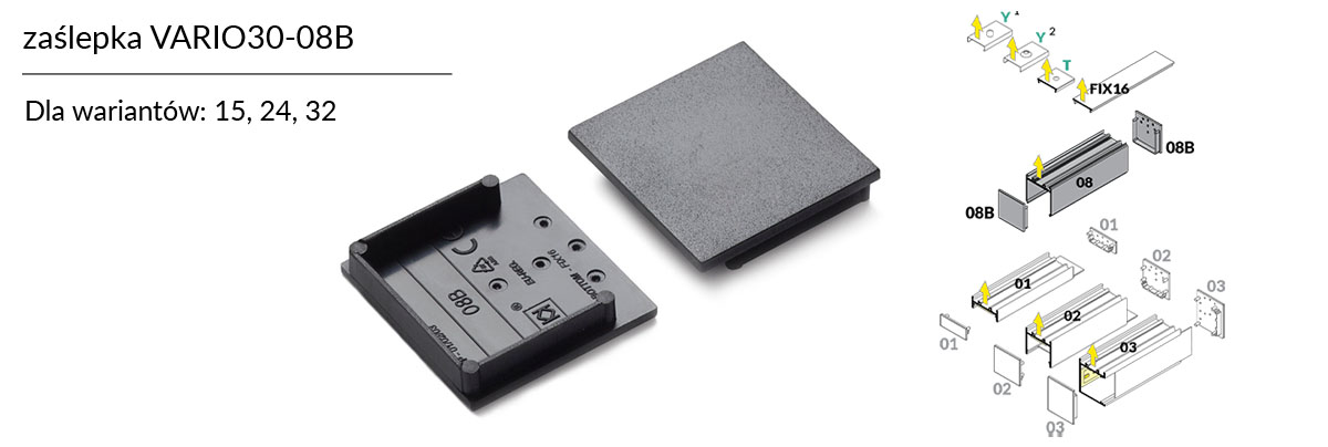 Każda z zaślepek dedykowanych dla systemu VARIO30 w swej budowie zawiera oznaczenia, które odpowiadają za kompatybilności zaślepki z wybranym profilem z układu VARIO30. Takie rozwiązanie pozwala na bezproblemowy i jednoznaczny dobór zaślepki do wybranego przez klienta wariantu.