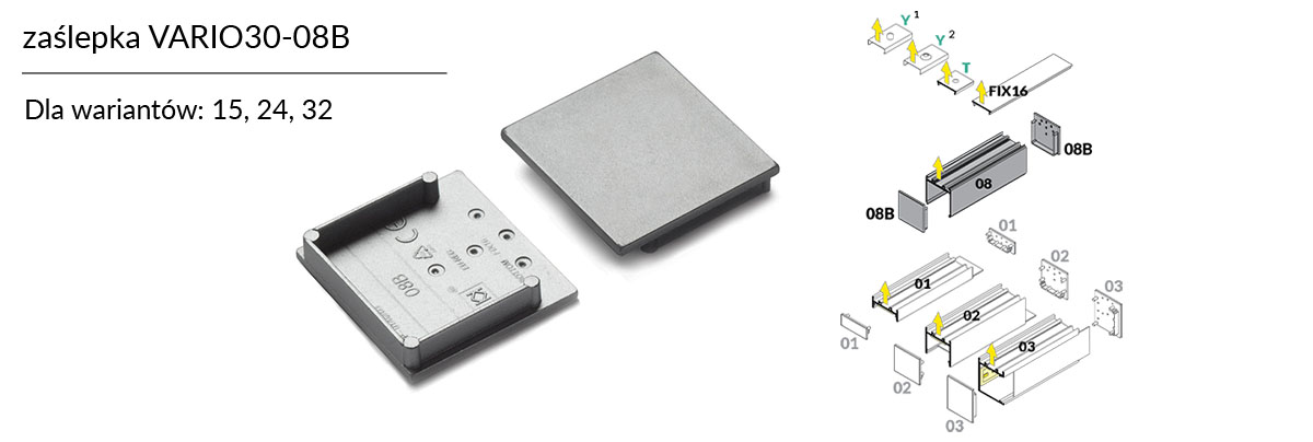 Każda z zaślepek dedykowanych dla systemu VARIO30 w swej budowie zawiera oznaczenia, które odpowiadają za kompatybilności zaślepki z wybranym profilem z układu VARIO30. Takie rozwiązanie pozwala na bezproblemowy i jednoznaczny dobór zaślepki do wybranego przez klienta wariantu.