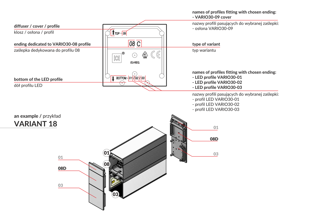 Ze względu na szeroką sposobność łączenia profilu alu LED VARIO-30-08 z innymi dostępnymi listwami z kolekcji VARIO30 wyprodukowane zostały komplety zaślepek (ABCD), spośród których każdy klient znajdzie odpowiednie dla niego rozwiązanie, unikając pomyłki przy doborze kompatybilnego komponentu.