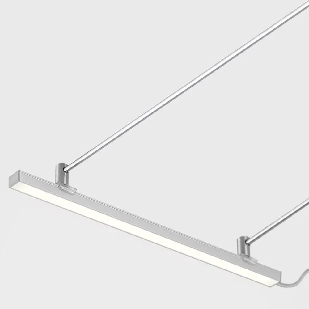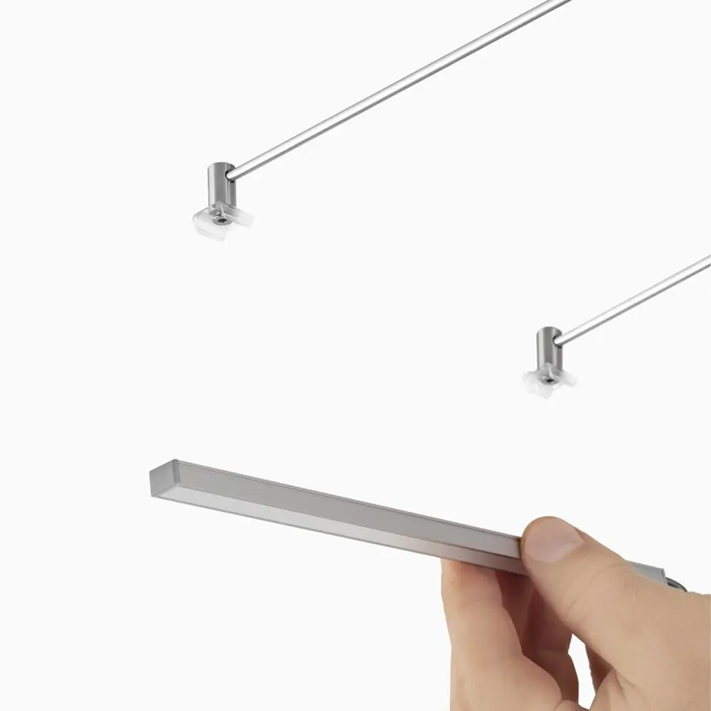 Zawieszka poprzeczna w srebrnym kolorze, wykonana ze stali nierdzewnej i tworzywa PC. Przeznaczona do montażu opraw oświetleniowych. Montaż do oprawy za pomocą mocownika, a do pręta za pomocą wkręta dociskowego. Zapewnia łatwy montaż i demontaż opraw - "na klik".